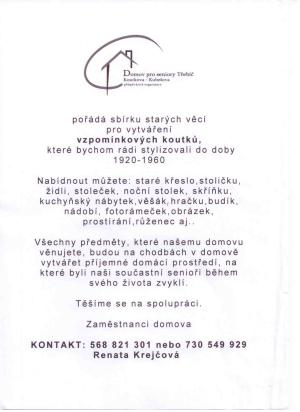 Pojďme společně vytvořit vzpomínkové koutky pro seniory. Domov pro seniory Třebíč, Koutkova - Kubešova pořádá sbírku starých věcí pro vytváření vzpomínek, které by rádi stylizovali do doby 1920 - 1960. Nabídnou můžete: staré křeslo, stoličku, židli, stoleček, noční stolek, skříňku, kuchyňský nábytek, věšák, hračku, budík, nádobí, fotorámeček, obrázek, prostírání, růženec aj....