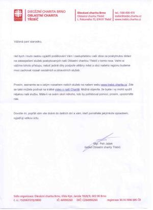 Rádi zveřejníme poděkování naší obci od ředitele Oblastní charity Třebíč Mgr. Petra Jaška.
