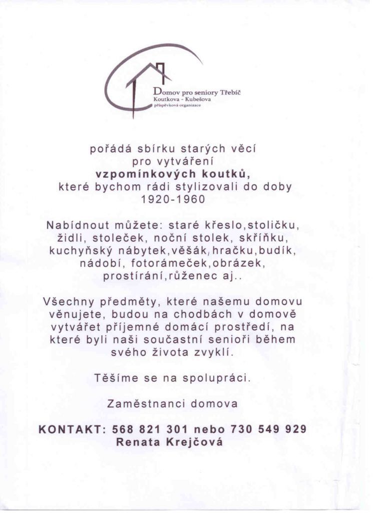 Pojďme společně vytvořit vzpomínkové koutky pro seniory. Domov pro seniory Třebíč, Koutkova - Kubešova pořádá sbírku starých věcí pro vytváření vzpomínek, které by rádi stylizovali do doby 1920 - 1960. Nabídnou můžete: staré křeslo, stoličku, židli, stoleček, noční stolek, skříňku, kuchyňský nábytek, věšák, hračku, budík, nádobí, fotorámeček, obrázek, prostírání, růženec aj....