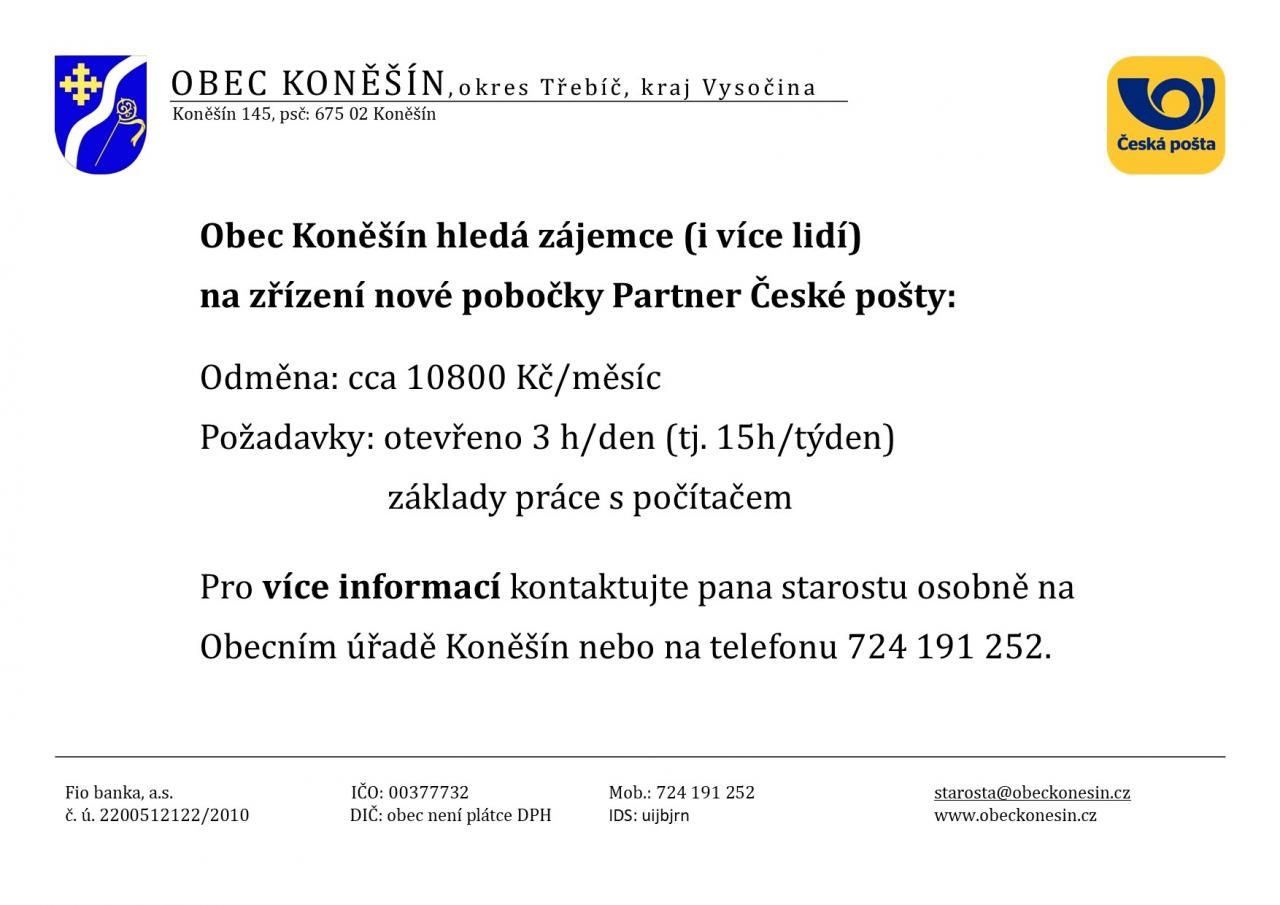 Obec Koněšín hledá zájemce o provozování pobočky Partner České pošty v Koněšíně. Stávající pobočka v obchodě bude v polovině letošního roku zrušena, a proto hledá obec náhradu.