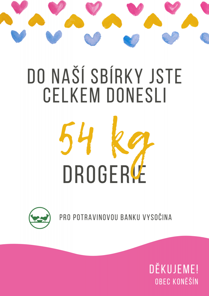 Obec Koněšín velice děkuje za Vaše dary. Celkem jsme sesbírali 470 kg potravin a 54 kg drogerie pro Potravinovou banku Vysočina.
