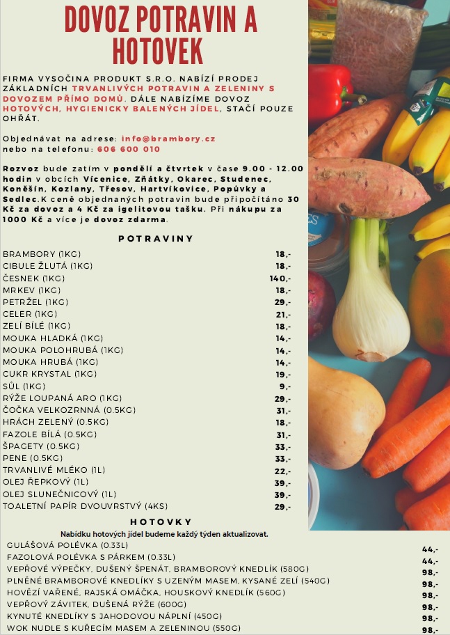 26.03.2020 Firma Vysočina Produkt nabízí prodej základních trvanlivých potravin a zeleniny s dovozem přímo domů. Dále nabízí dovoz balených hotových jídel.
