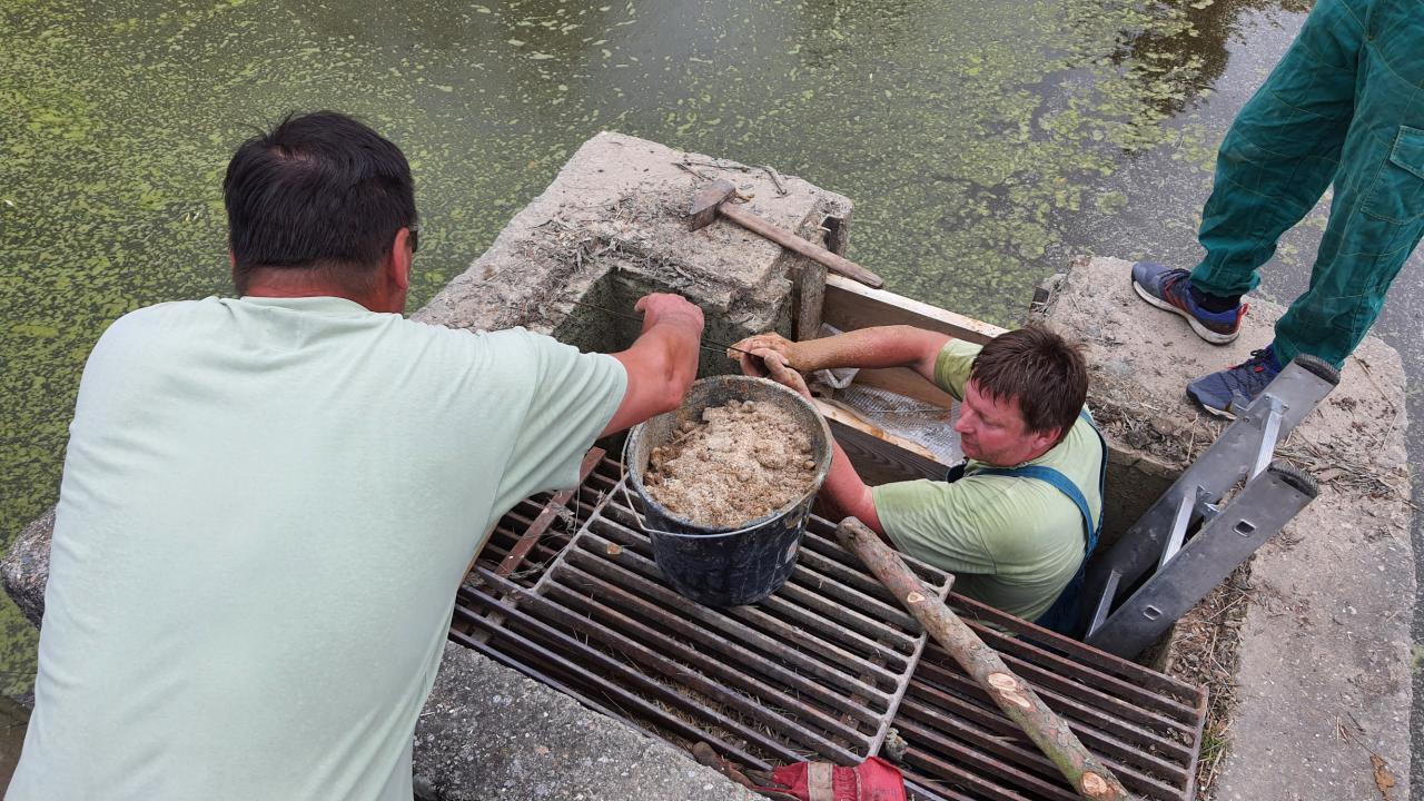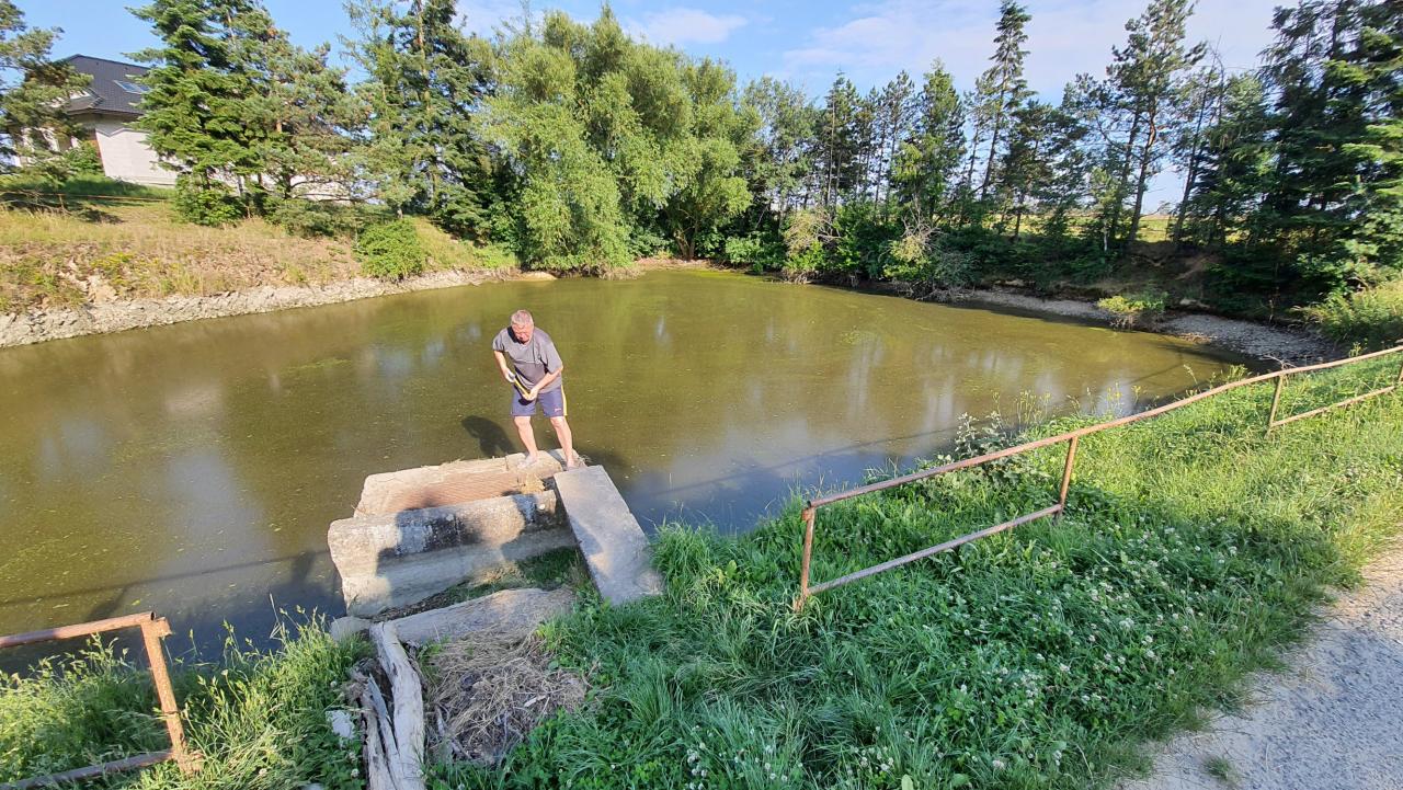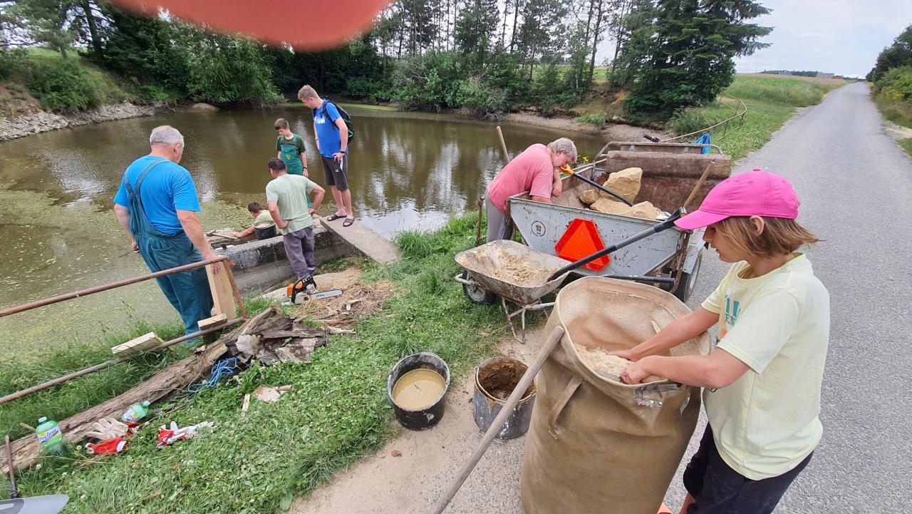 V neděli dne 4. 7. 2021 byl zjištěn úbytek vody v nádrži zhruba o 90 cm, což je přibližně polovina celkového objemu. Po bližším zkoumání bylo zjištěno prasklé prkno v hrázi, přes které voda odtekla. Místní dobrovolníci tak neváhali, sehnali jíl, piliny a prkna a v pondělí 5. 7. provedli opravu. Tímto moc děkujeme všem zúčastněným včetně kolemjdoucích, kteří také připojili ruce k dílu.