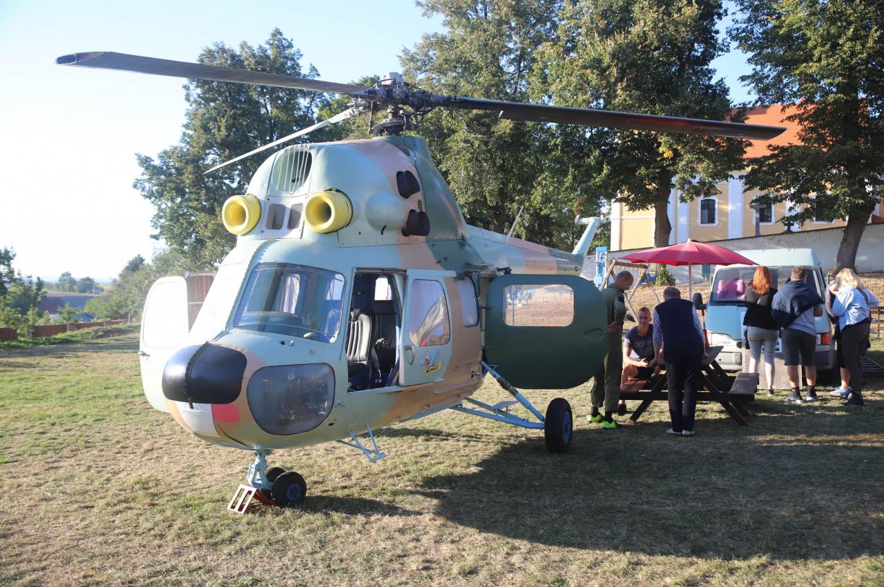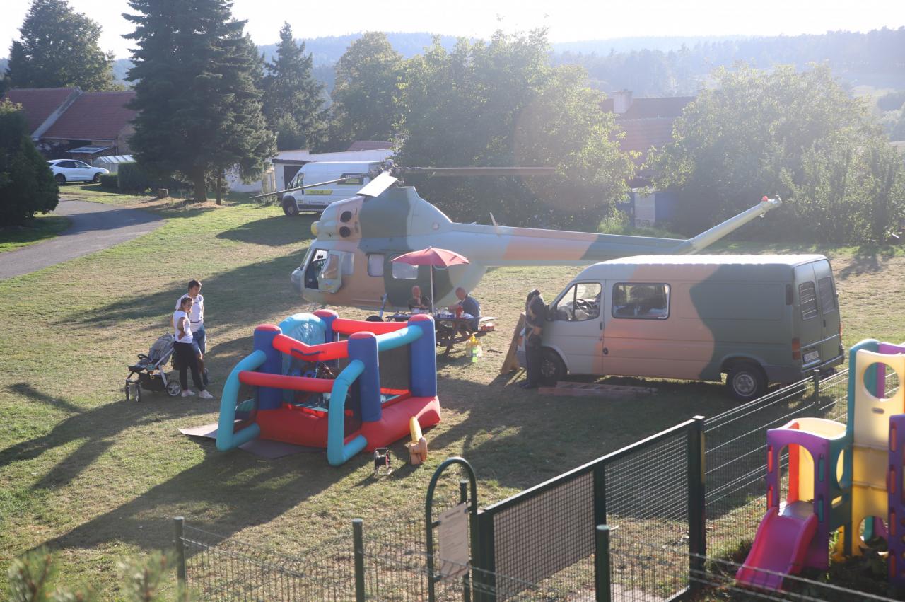 Staré hřiště - letecké muzeum přivezlo na ukázku vrtulník a pro děti nafukovací hrad.