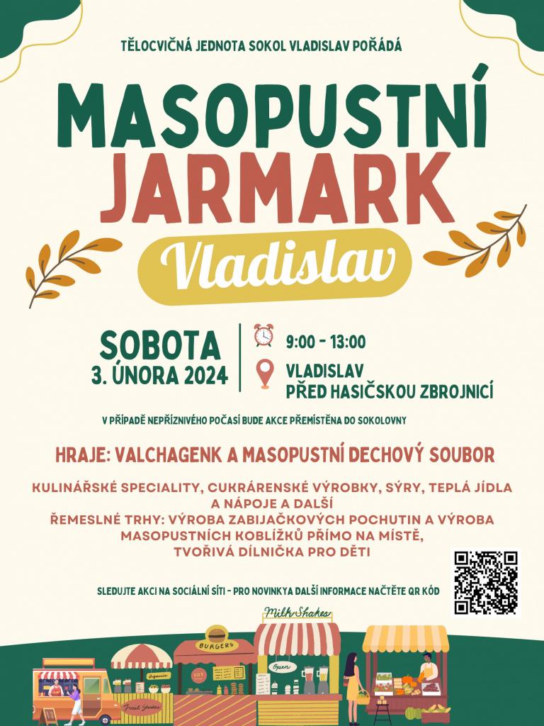 Živá hudba v podání kapely Valchagenk a Masopustního dechového souboru, široký sortiment teplého občerstvení a nápojů, zabijačkové speciality, ukázka výroby masopustních koblížků a Božích milostí, bohatá nabídka drobného zboží, tvořivá dílnička pro děti.